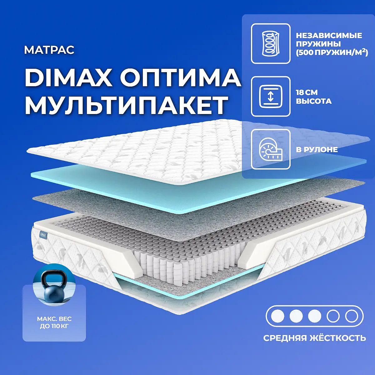 Матрас Dimax Оптима Мультипакет — это удобный пружинный матрас средней высоты, созданный для комфортного сна каждый день. Основу изделия составляет современный блок независимых пружин (500 шт/м2), который обеспечивает точечную поддержку тела без эффекта «волны». Такой матрас хорошо подходит для сна в разных положениях и рассчитан на нагрузку до 110 кг на одно спальное место. С обеих сторон матраса использован слой эластичного пенополиуретана (ППУ) толщиной 2 см, который равномерно распределяет нагрузку и добавляет мягкости. Между пружинами и ППУ расположен износостойкий войлок, увеличивающий срок службы изделия и поддерживающий стабильную жёсткость. Чехол выполнен из прочного трикота, простёган на синтепоне, что делает поверхность матраса приятной на ощупь и аккуратной на вид. Модель поставляется в скрученном виде, что облегчает транспортировку и позволяет сохранить свежесть изделия до момента использования. При правильном хранении в рулоне, матрас сохраняет свои свойства до 3 месяцев с даты производства. Характеристики