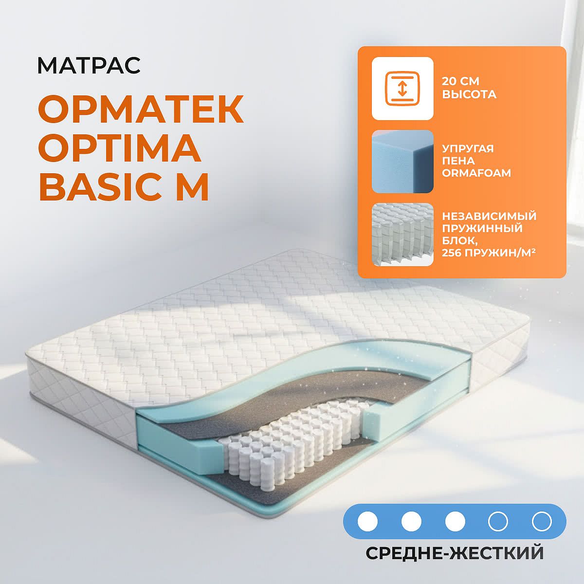 Матрас «Орматек Optima Basic M» — средней жесткости, которая комфортна большинству людей среднего телосложения. Это — универсальный вариант и детям, и взрослым, и пожилым людям.